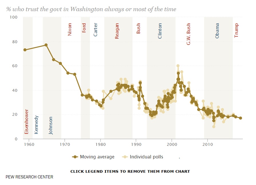 Drutman recites the statistics familiar to most of us about how dissatisfied Americans are with their government today. Distrust in the government has never been higher. Voting turnout is still among the lowest in the world. And never have fewer Americans been willing to identify with either of our two parties.