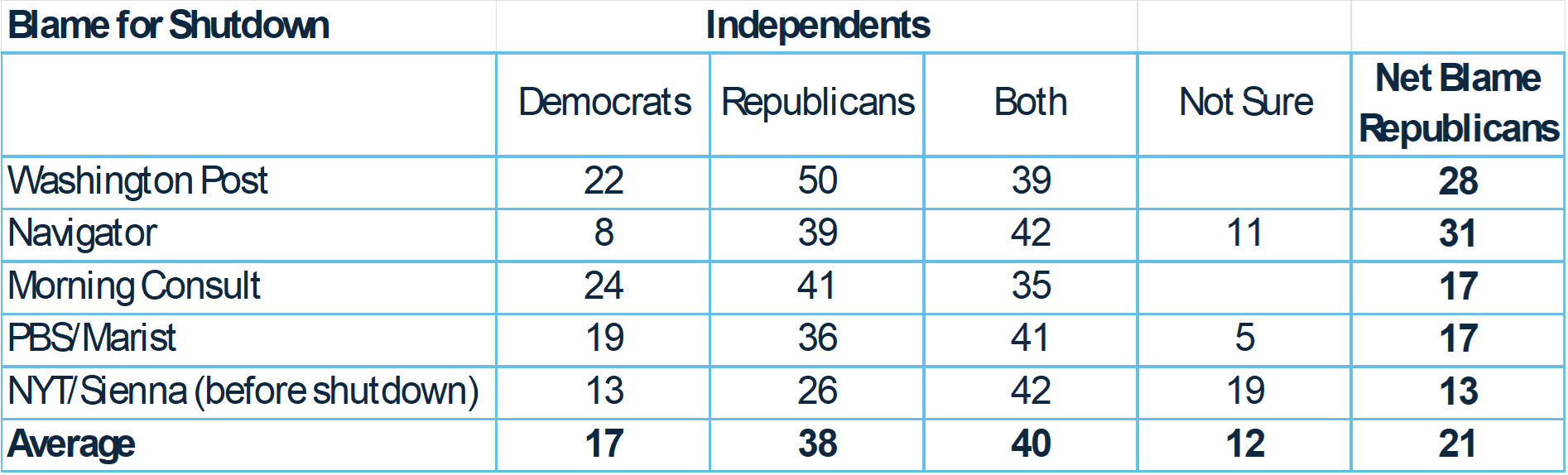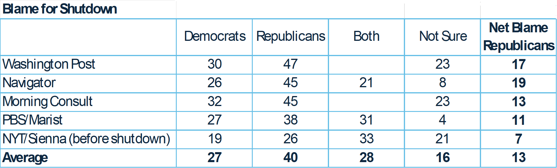 So far, more Americans are blaming Republicans than Democrats for the shutdown – and it is not close. Since the shutdown began, four polls have asked Americans who they blame most for the shutdown. In addition, one poll was conducted just before the shutdown began. This is the summary of those five polls.