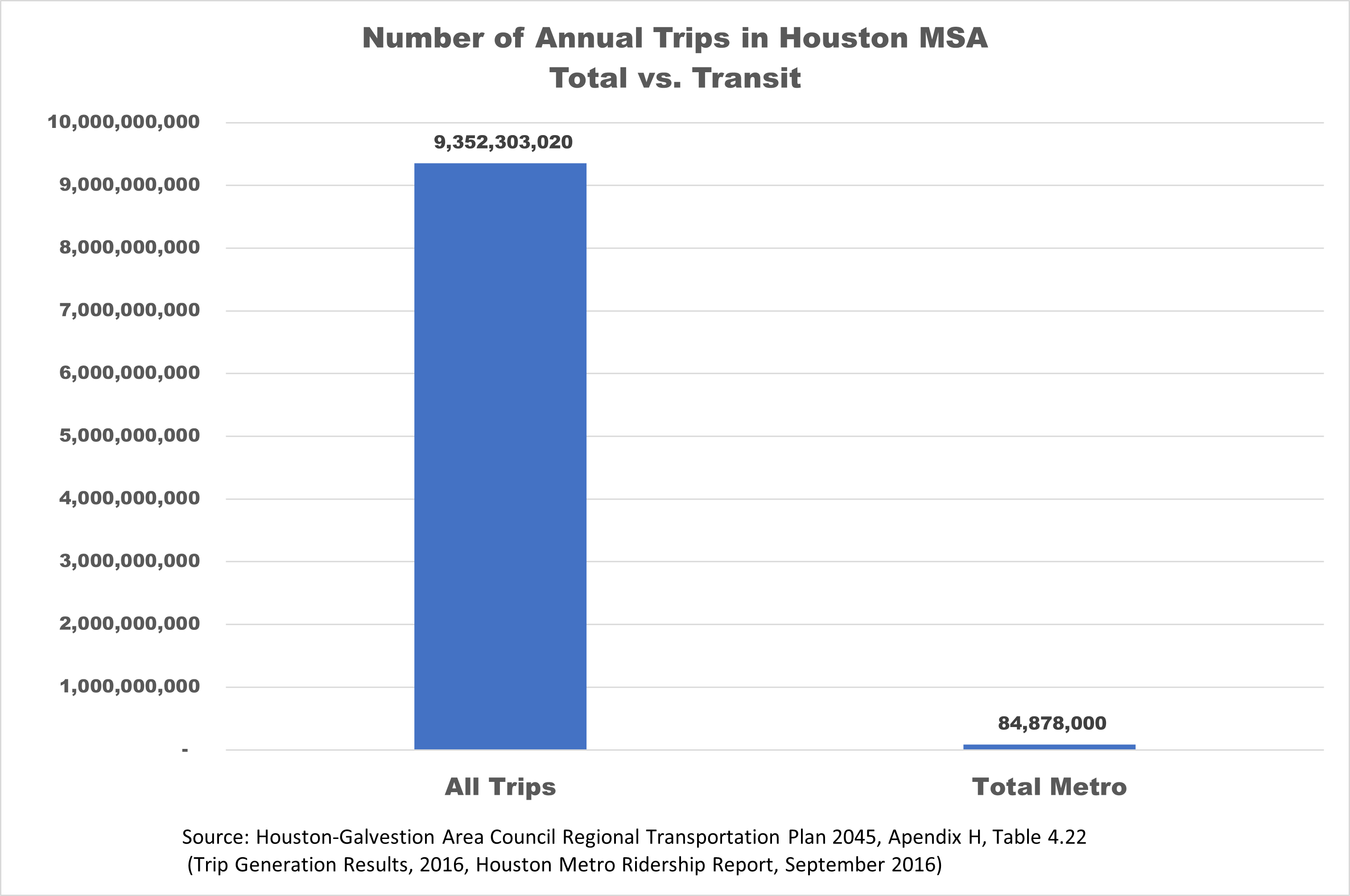 So, on a national basis, and in Houston, the contribution of transit to overall mobility is miniscule. Certainly, there are specific markets in very densely populated cities, like New York and Chicago, where transit is an important component to those cities’ overall mobility. But when it comes to analyzing the effect of transit on factors such as traffic congestion and air pollution, it is important to understand what a tiny portion of daily trips are made on transit. I will be writing soon on those two issues specifically.